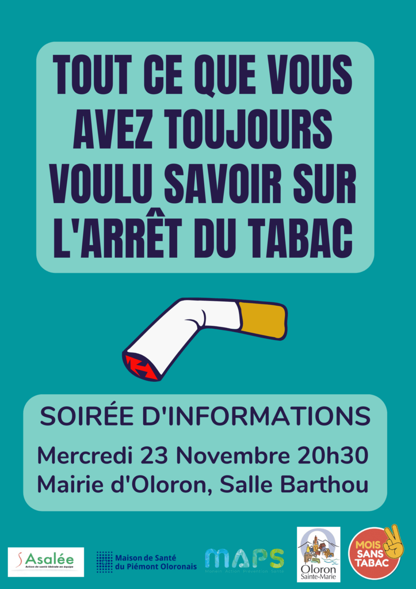 Arrêt du tabac : soirée d’information+ Ajouter à mon Agenda Google+ Exporter vers iCal Date23 Nov 2022Evénements éxpirés Heure 20h30 LieuSalle Barthou, Mairie d'OloronSalle Barthou, Mairie d'Oloron Catégorie SantéProchain Événement « Bullez à la Confluence » 4e édition du prix littéraire BD du Haut-Béarn Date04 Nov 2025 - 30 Mai 2026 Heure Toute la journéePartagez cet événement