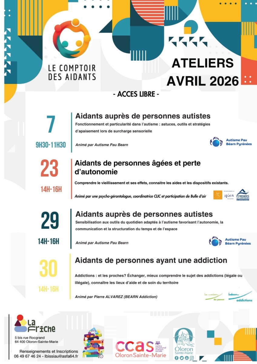 Atelier aidants de personnes âgées et perte d’autonomie+ Ajouter à mon Agenda Google+ Exporter vers iCal Date23 Avr 2026 Heure 14h00 - 16h00 LieuLa Friche14 avenue Sadi Carnot Catégorie Je participe SantéProchain Événement « Bullez à la Confluence » 4e édition du prix littéraire BD du Haut-Béarn Date04 Nov 2025 - 30 Mai 2026 Heure Toute la journéePartagez cet événement