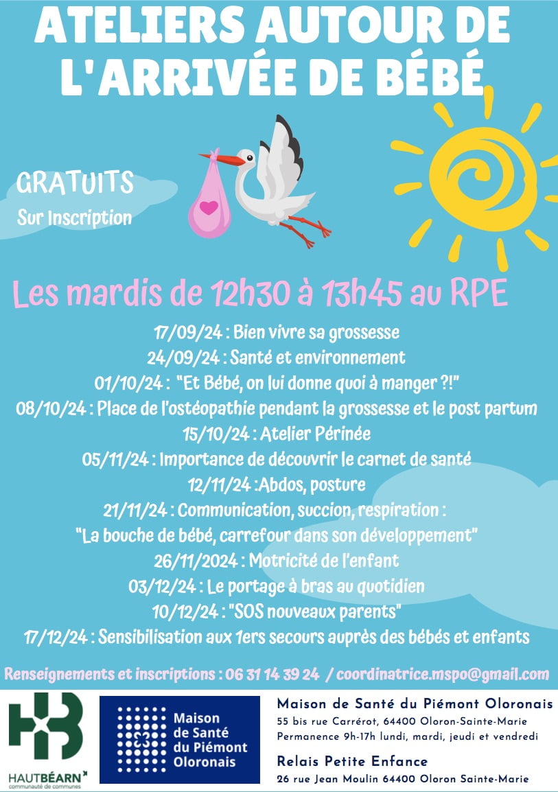 Ateliers autour de l’arrivée de bébéEn savoir plus+ Ajouter à mon Agenda Google+ Exporter vers iCal Date17 Déc 2024Evénements éxpirés Heure 12h30 - 13h45 LieuRelais Petite Enfance26 rue Jean Moulin 64400 OLORON SAINTE MARIE Catégorie Je participe Jeunesse SantéProchain Événement Expo EMECKA Date01 - 30 Nov 2025 Heure 8h00 - 18h00Partagez cet événement