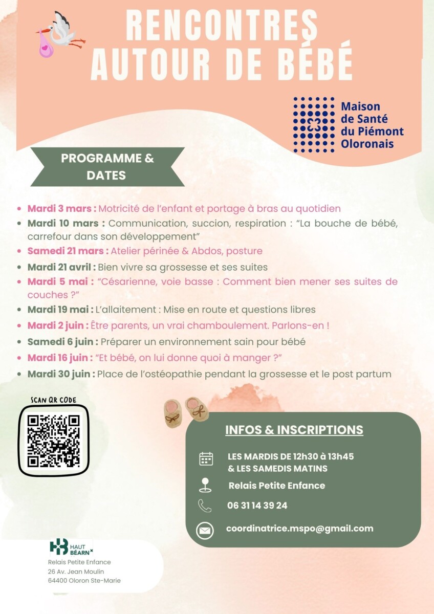 Bébé : motricité de l’enfant et portage à bras au quotidien+ Ajouter à mon Agenda Google+ Exporter vers iCal Date03 Mar 2026 Heure 12h30 - 13h45 LieuRelais Petite Enfance26 rue Jean Moulin 64400 OLORON SAINTE MARIE Catégorie JeunesseProchain Événement « Bullez à la Confluence » 4e édition du prix littéraire BD du Haut-Béarn Date04 Nov 2025 - 30 Mai 2026 Heure Toute la journéePartagez cet événement