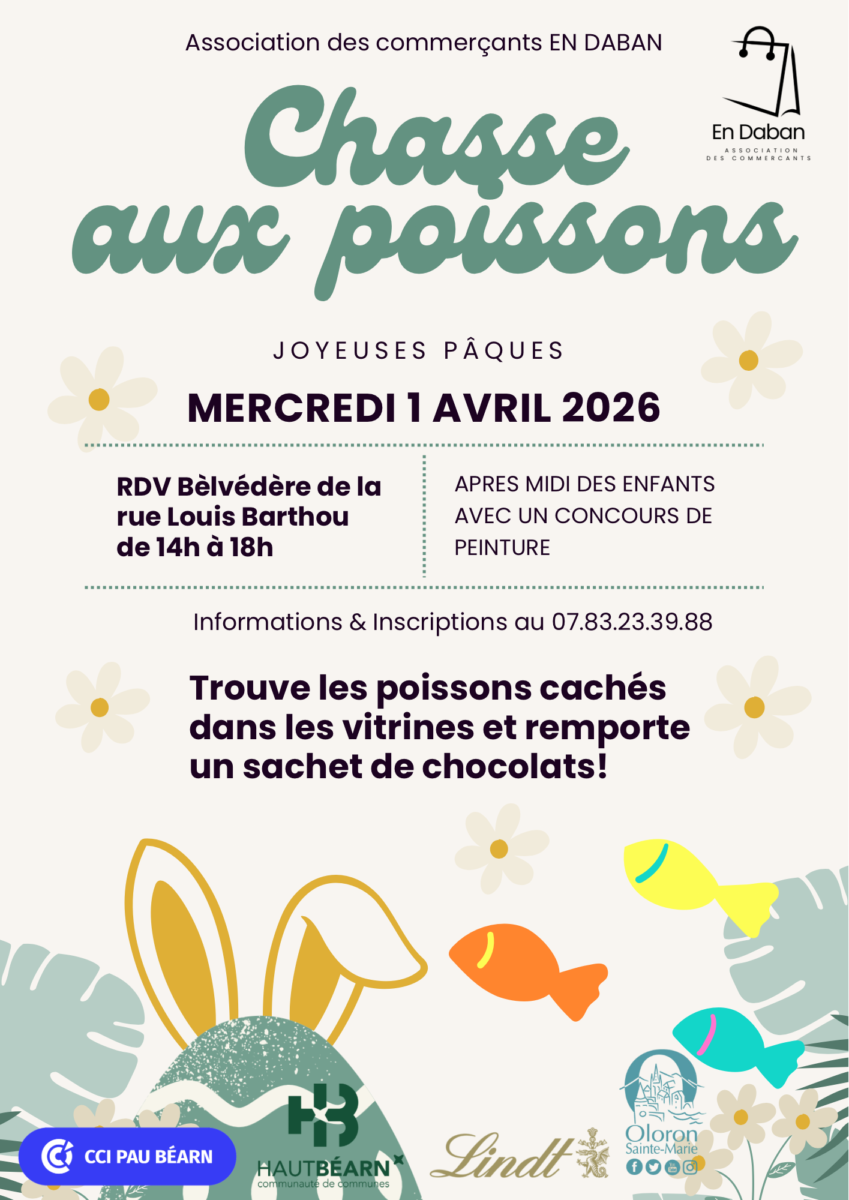 « Chasse aux poissons » dans les vitrines de vos commerces+ Ajouter à mon Agenda Google+ Exporter vers iCal Date01 Avr 2026Evénements éxpirés Heure 14h00 - 18h00 LieuBelvédère Barthou Catégorie CommercesProchain Événement « Bullez à la Confluence » 4e édition du prix littéraire BD du Haut-Béarn Date04 Nov 2025 - 30 Mai 2026 Heure Toute la journéePartagez cet événement