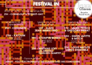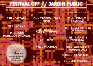 Le festival se poursuivra avec un ciné-concert au Luxor, un Jazz Club au Centre Social, une soirée Brass band à Jéliote et enfin, 3 jours de concerts gratuits au Jardin Public lors du deuxième weekend. Tous les styles y seront représentés, avec la techno jazz de Photons, le maloya de Gaël Horellou, le High Life de Ah! Kwantou ou encore l’open jazz de Daoud, mais aussi la 17ème édition du Tremplin Jazz à Oloron !