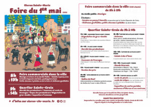 La foire commerciale s’installera autour du Jardin Public et dans les rues adjacentes avec plus de 250 stands, de 8h à 19h. Comme chaque année, cinq associations locales (foot, rugby, hand, pala et Radio Oloron) participent en animant des buvettes.