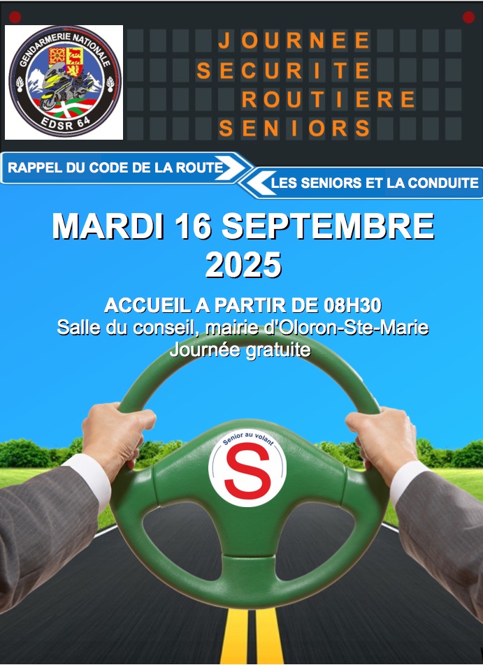 Journée sécurité routière séniorsTéléchargez le coupon-réponse ici+ Ajouter à mon Agenda Google+ Exporter vers iCal Date16 Sep 2025Evénements éxpirés Heure 8h30 LieuSalle Barthou, Mairie d'OloronSalle Barthou, Mairie d'OloronProchain Événement « Bullez à la Confluence » 4e édition du prix littéraire BD du Haut-Béarn Date04 Nov 2025 - 30 Mai 2026 Heure Toute la journéePartagez cet événement