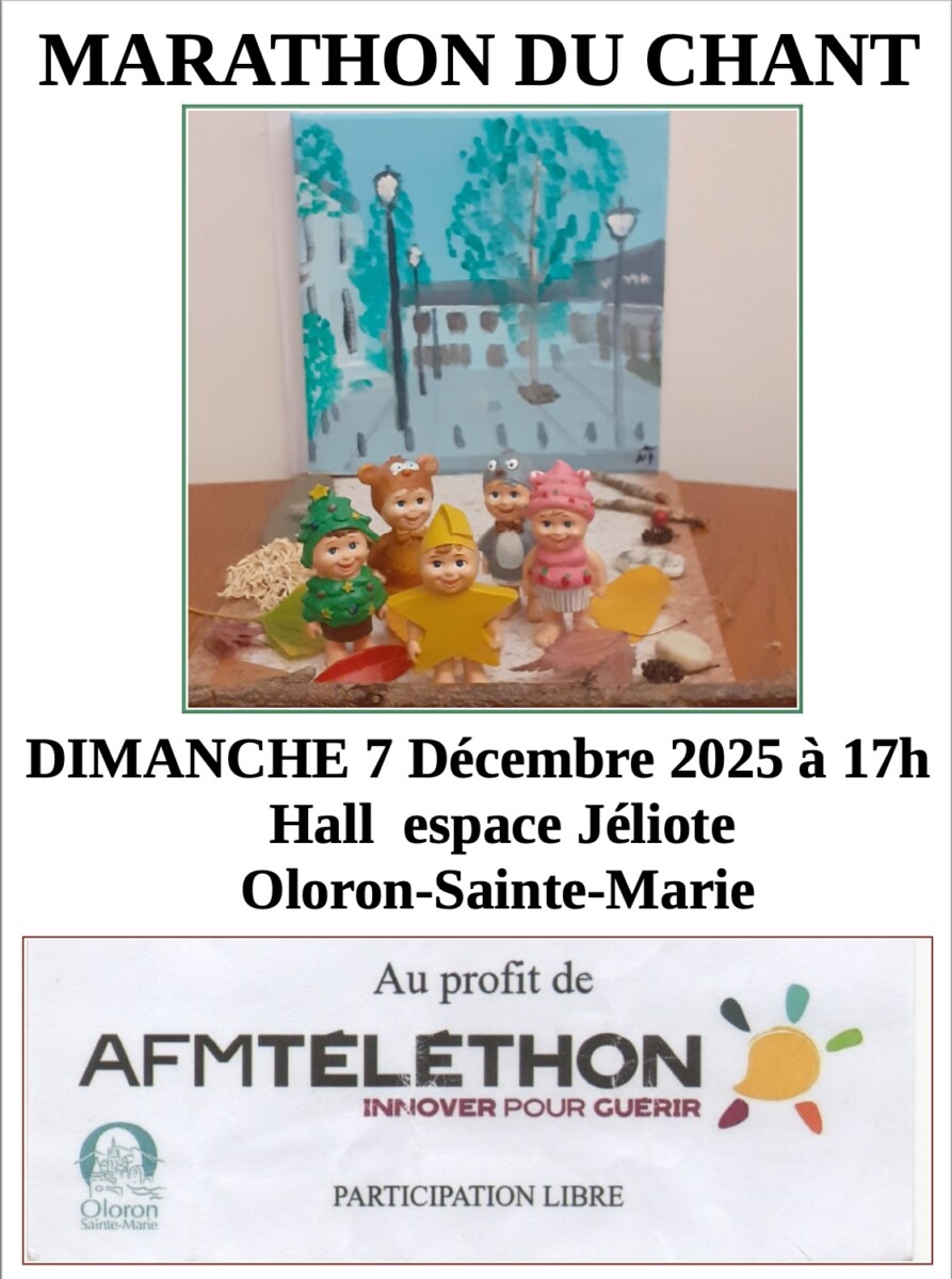 La Samaritaine, Sensible, Les Chansonneurs, La Villanelle, Estailh, Les Tit’ Notes, Inattendu et Les Olds Blacks, 8 groupes de chanteurs et musiciens s’associent pour le Marathon du chant au profit du Téléthon à Oloron Sainte-Marie le dimanche 7 décembre 2025 à partir de 17h dans le hall de l’espace Jéliote.