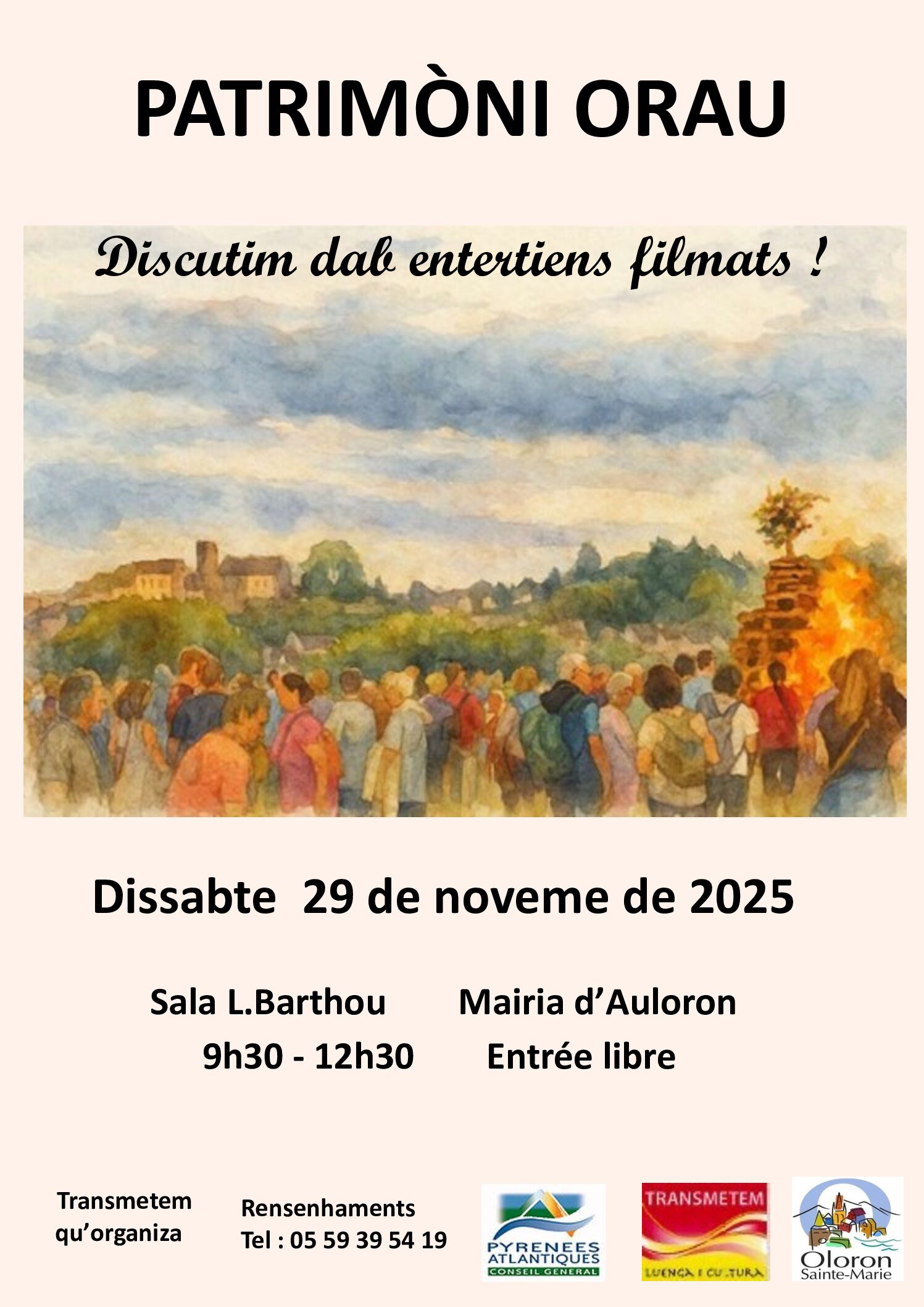 Patrimòni orau+ Ajouter à mon Agenda Google+ Exporter vers iCal Date29 Nov 2025 Heure 9h30 - 12h30 LieuSalle Barthou, Mairie d'OloronSalle Barthou, Mairie d'Oloron Catégorie Culture Je participeProchain Événement Expo EMECKA Date01 - 30 Nov 2025 Heure 8h00 - 18h00Partagez cet événement