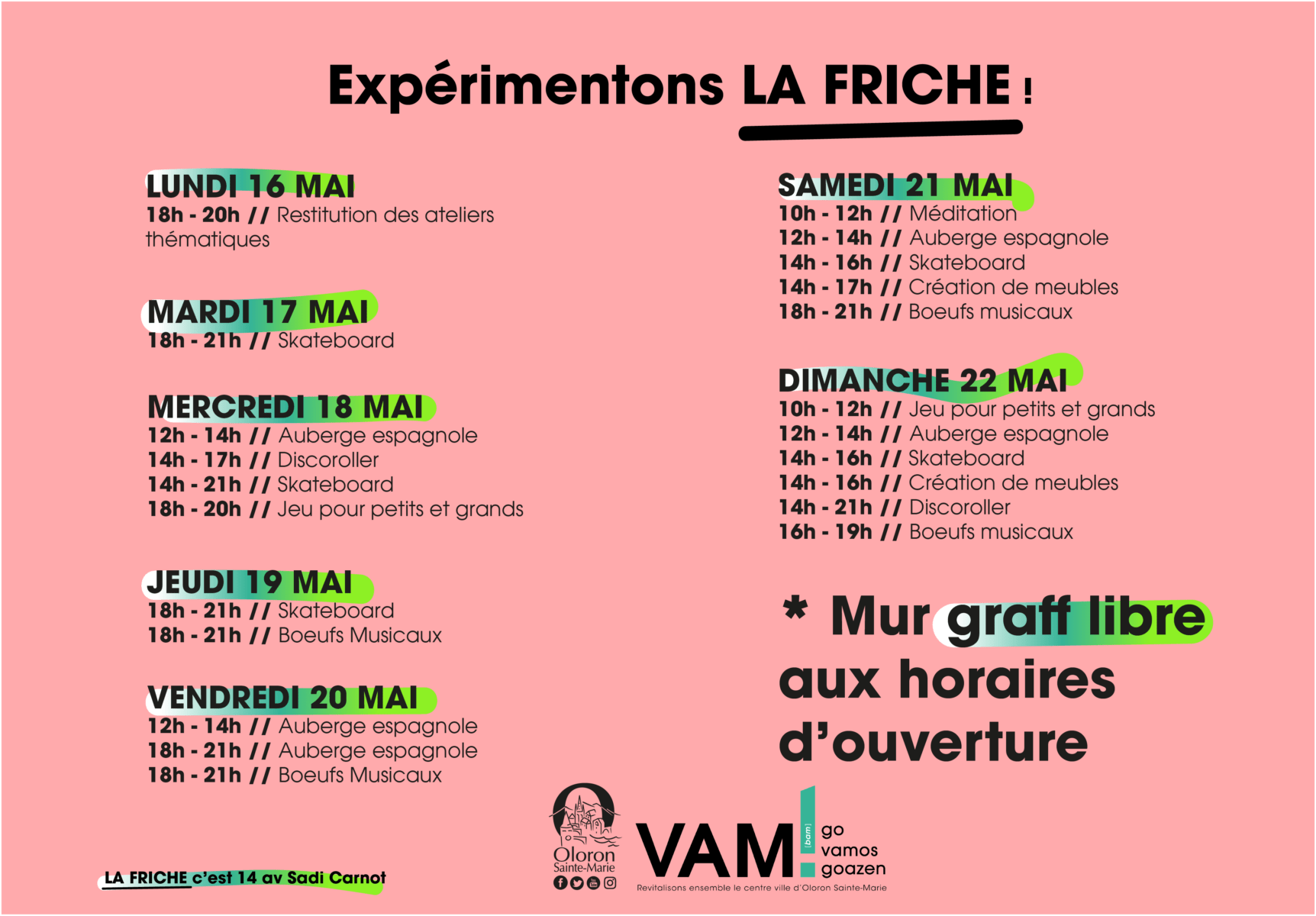 Cette semaine d’expérimentations sera éclectique et conviviale, à l’image de ce que souhaite la population sur le site. On y trouvera notamment : des auberges espagnoles, une ludothèque, un espace skate/roller, du graf, un temps pour une assemblée citoyenne, un food-truck, un atelier de fabrication de meubles à base de récup, etc.