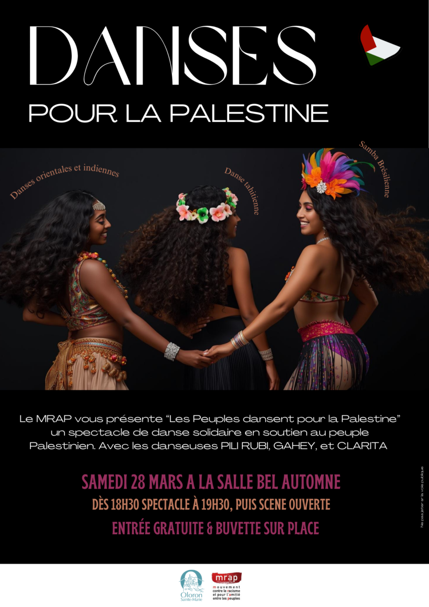 Spectacle « Les peuples dansent pour la Palestine »+ Ajouter à mon Agenda Google+ Exporter vers iCal Date28 Mar 2026 Heure 19h30 LieuSalle du Bel AutomneSalle du Bel Automne Catégorie Culture SpectaclesProchain Événement « Bullez à la Confluence » 4e édition du prix littéraire BD du Haut-Béarn Date04 Nov 2025 - 30 Mai 2026 Heure Toute la journéePartagez cet événement