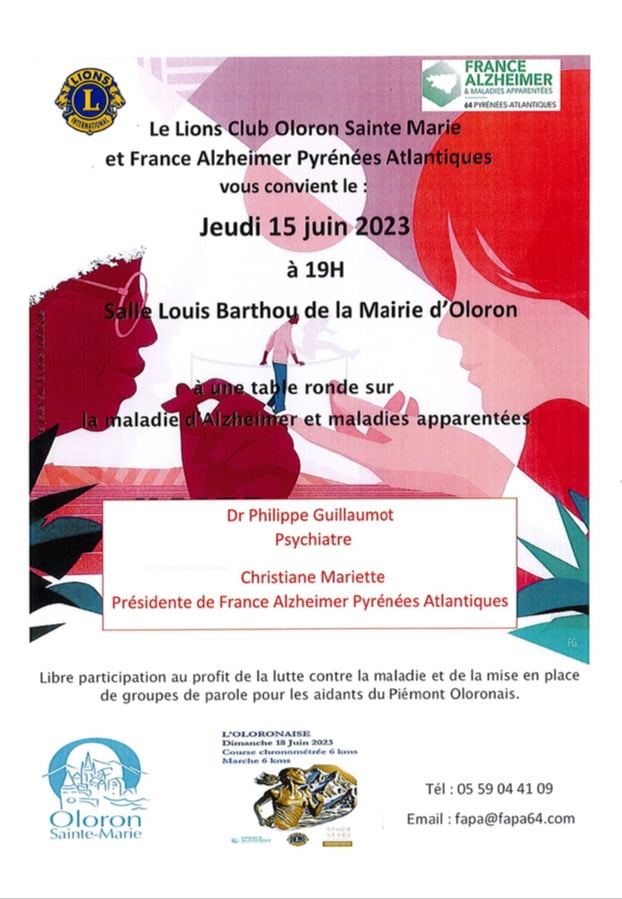 Table ronde sur la maladie d’Alzheimer+ Ajouter à mon Agenda Google+ Exporter vers iCal Date15 Juin 2023Evénements éxpirés Heure 19h00 LieuSalle Barthou, Mairie d'OloronSalle Barthou, Mairie d'Oloron Catégorie SantéProchain Événement « Bullez à la Confluence » 4e édition du prix littéraire BD du Haut-Béarn Date04 Nov 2025 - 30 Mai 2026 Heure Toute la journéePartagez cet événement