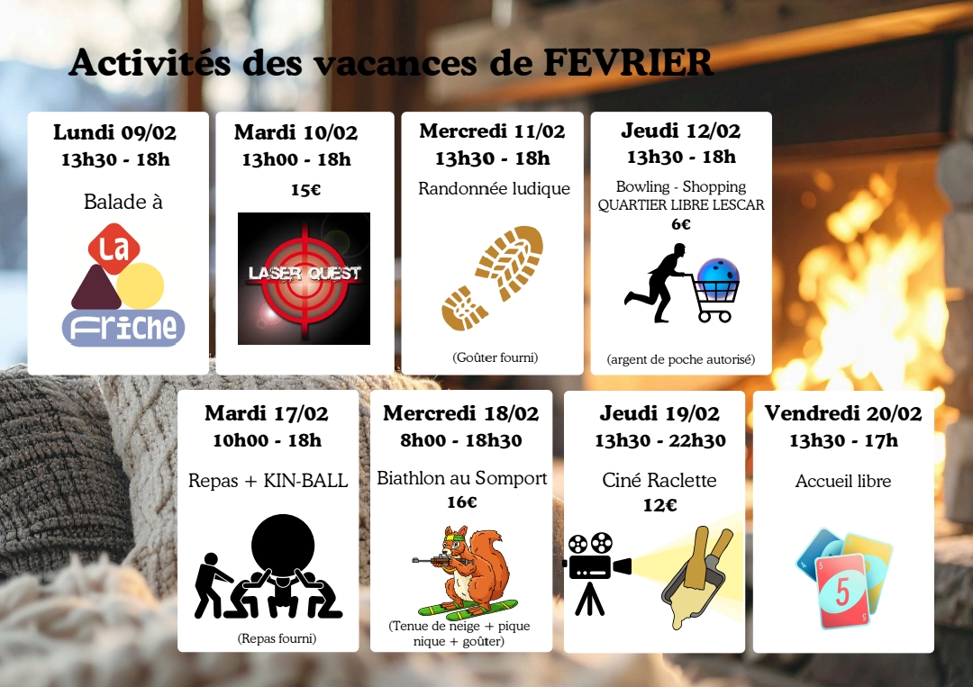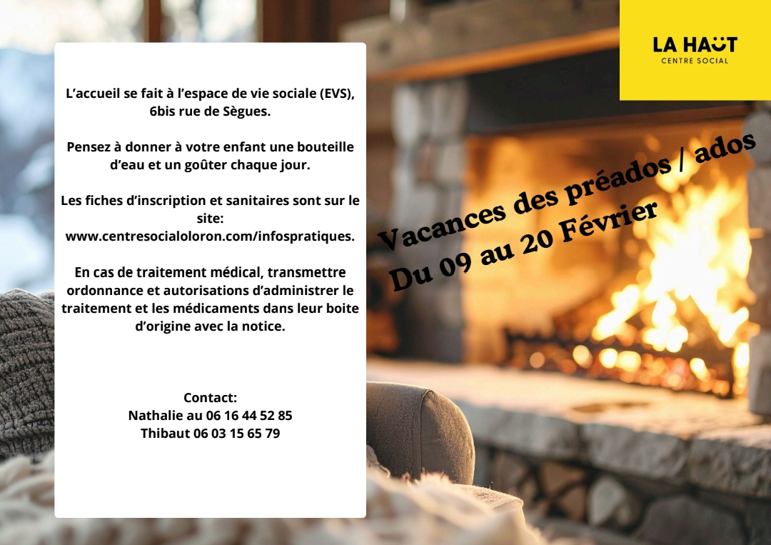 Vacances d’hiver : activités préados et ados au Centre SocialVoir le programme+ Ajouter à mon Agenda Google+ Exporter vers iCal Date09 - 20 Fév 2026En cours... Heure Toute la journée Catégorie Je participe JeunesseProchain Événement « Bullez à la Confluence » 4e édition du prix littéraire BD du Haut-Béarn Date04 Nov 2025 - 30 Mai 2026 Heure Toute la journéePartagez cet événement