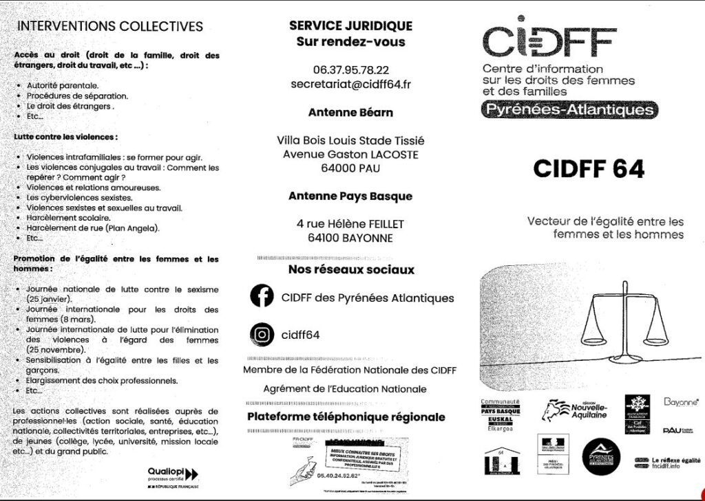 Le CIDFF (Centre d’Information sur les Droits des Femmes et des Familles) tient une permanence au CCAS le 1er mardi de chaque mois, de 14h à 16h, sur rdv au 06.37.95.78.22.